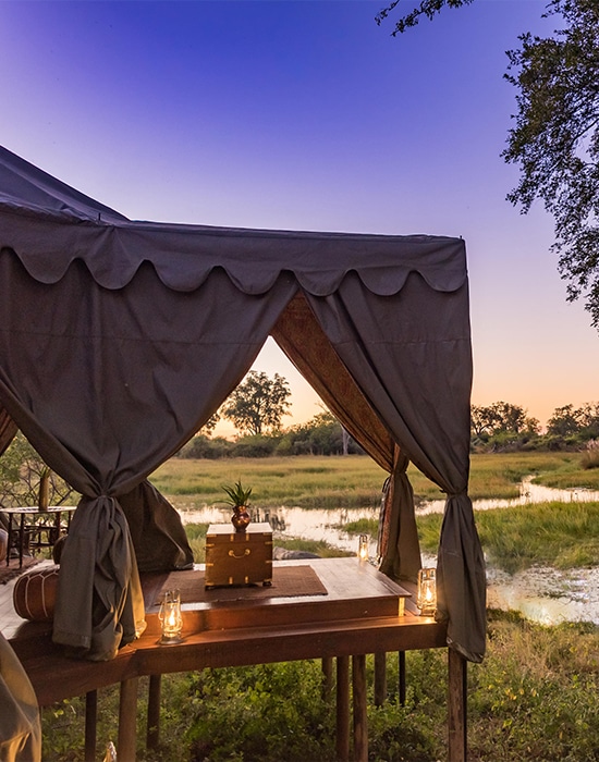 Each season offers its own distinct characteristics and opportunities to explore the magnificent Okavango Delta and Duke’s Camp provides the perfect base from which to do so. Open year-round, the camp is unfiltered African wilderness paired with an unmistakable safari flair. Pitched in a remote region on a northern Okavango Delta channel, completely surrounded by wilderness, enjoy spectacular views of the seasonal lagoon and floodplain from the luxury of your under-canvas suite at this unfenced camp, where the Delta is your playground.