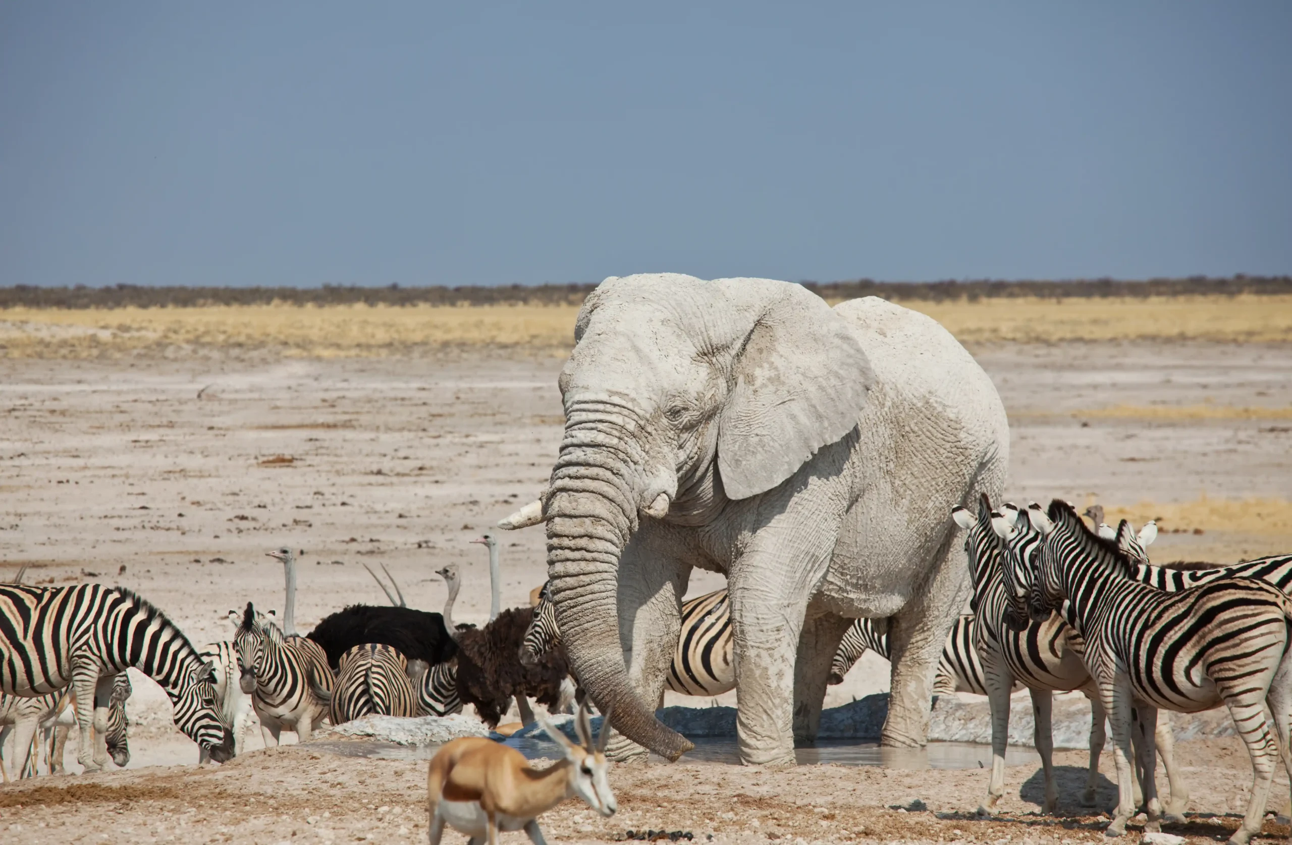 Malaria-free in the winter months, Etosha National Park is a vast, lush wildlife paradise situated in the north west of Namibia in the Kunene region. It is home to the country’s greatest variety of mammals and birds and the famous “ghost” elephants, who cake themselves in white calcite sand to escape the heat of the day.
