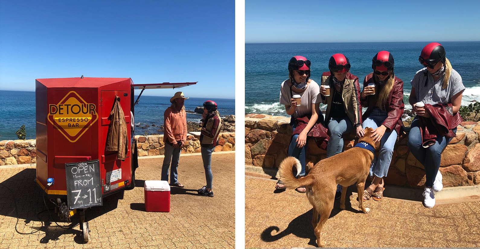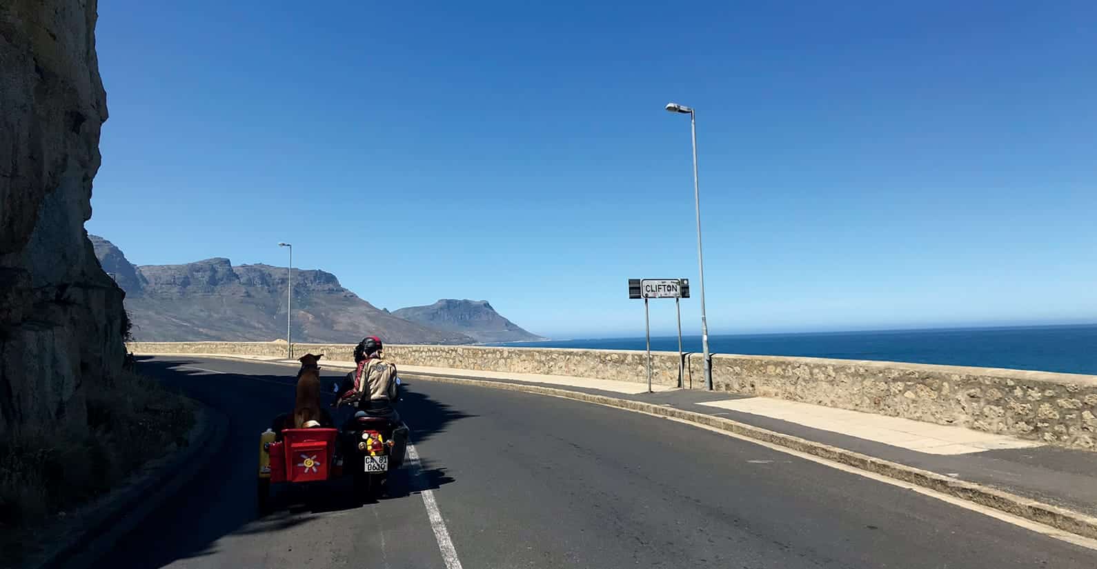 Starting at our offices in the heart of the CBD, we were welcomed by Cape Sidecar Adventure team members Tim, Bradley, their furry team mascot Brody and our valiant steeds Wanda and Lolita. After giving us the low-down on biking etiquette, we decided on our 2-hour route and geared up – helmet, goggles, leather jacket and all. With one passenger in the sidecar and one on the back seat of the CJ 750, our marketing team (turned biker gang), headed off towards Sea Point, passing the iconic Green Point Stadium with Table Mountain at our backs. With the wind in our hair, it was obvious that this tour of Cape Town was completely unique – from Bradley’s informative Cape Town facts to Brody resting his head on his sidecar partner’s shoulder. We continued on the coastal road towards Camps Bay Beach, stopping for an Instagram worthy photo. Time for the open road – we headed out along the scenic 12 Apostles drive with a quick cappuccino pitstop en route at the quirky Detour Espresso Bar perched on a lookout stop overlooking the Atlantic Ocean. We headed over the mountain towards the Hout Bay harbour to catch a glimpse of the resident seals and fishing boats departing for their daily catch before heading back into town over the scenic Kloof Nek drive.