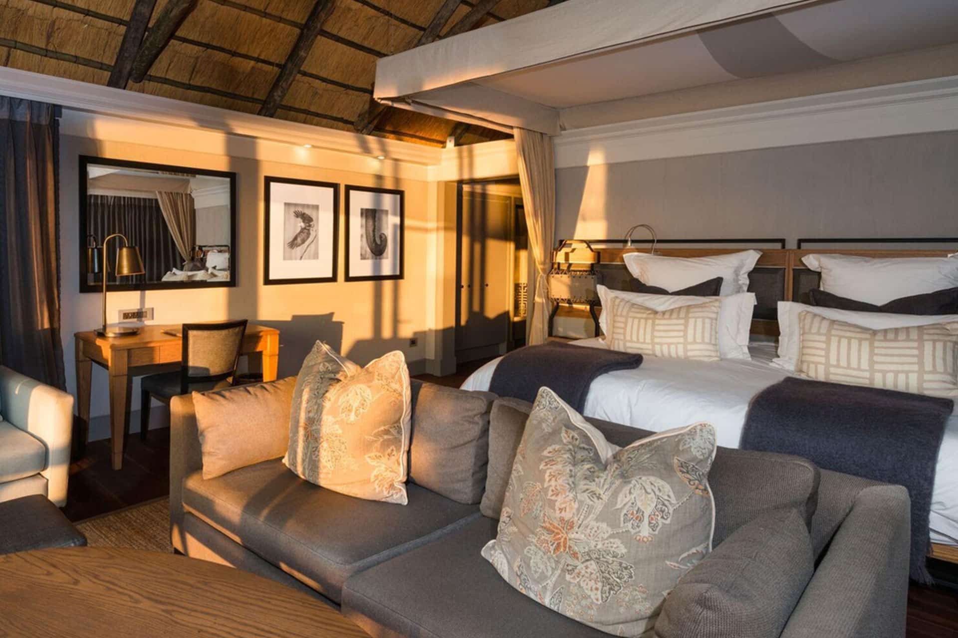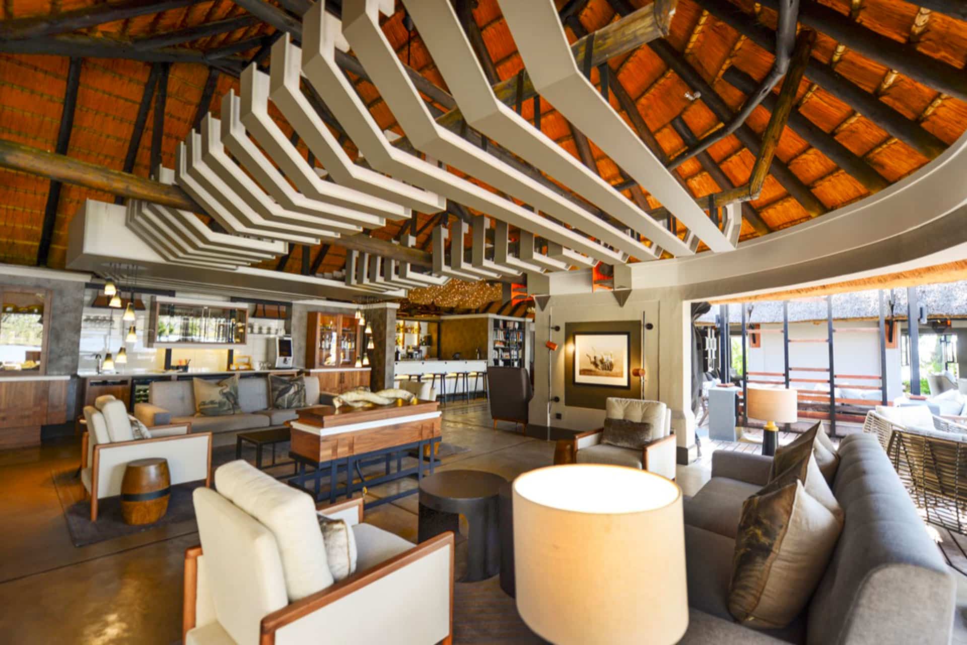 A warm, traditional Namibian welcome of singing and dancing awaited us as we arrived at the main lodge, situated under a mass of beautiful, indigenous acacia trees. Entering the space, I was amazed at the transition from what I had seen from the boat. From the water, the lodge and bungalows, with their thatched roofs and wooden exterior, gave the impression of a typical African lodge – donned with safari-style browns and ochres. It is anything but that.