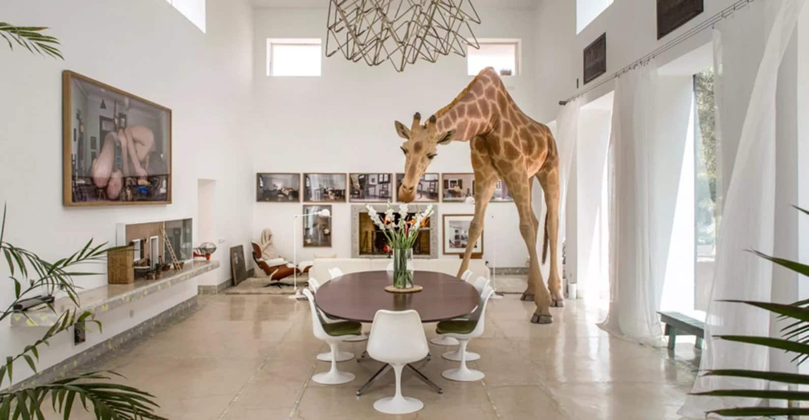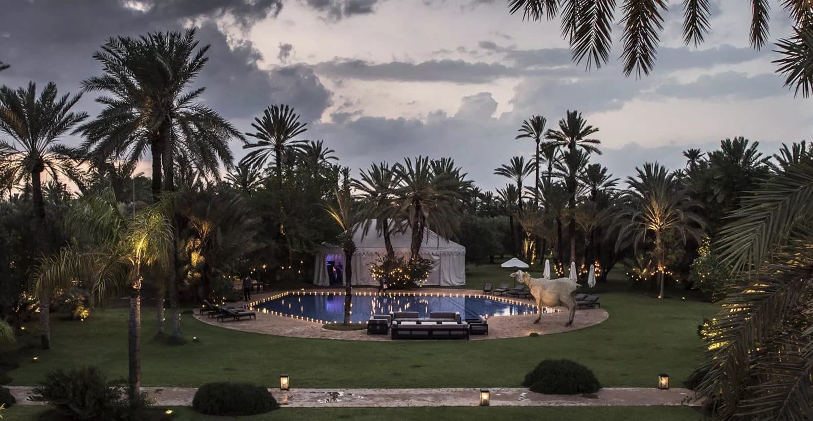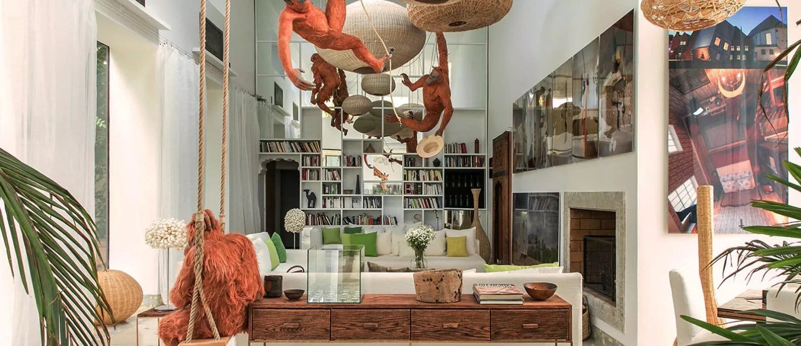 A 15 minute drive from the ‘Red City’, within the Palmeraie of Marrakech, you will find the exotic haven of artist Jean-Francois Fourtou. As an outsider one might never imagine the enchanting world that awaits within the perimeters of the 25 acre estate but as soon as you enter the grounds you are slowly introduced to the quirks of the property. From sculptures of mischievous orangutans swinging from the ceiling to giraffes munching on flower arrangements from the dining room table. In the garden, indulge your childlike impulses and explore Fourtou’s sculpture garden from the Fallen From The Sky to the Giant’s House. Originally the artist’s home, the fully staffed villa is now up for private hire, inviting guests to explore the lush gardens of the estate, wander through the olive grove maze, relax by the pool in the mimosa courtyard and get lost in the playful world of Dar El Sadaka.