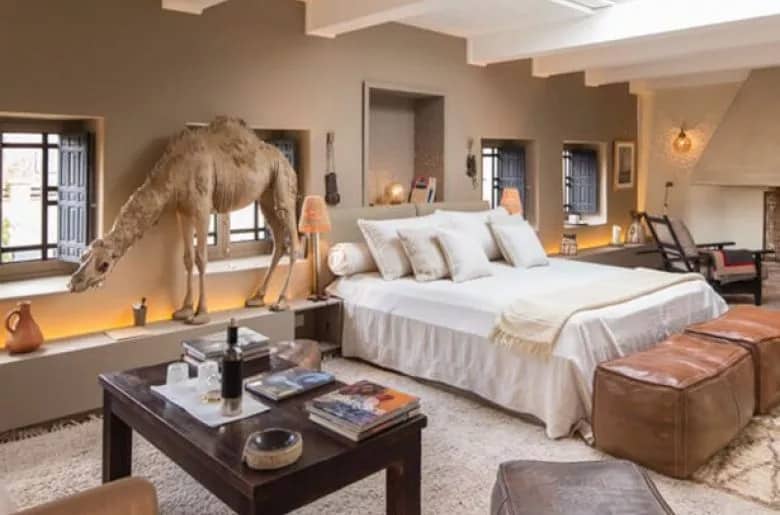 An impressive mix of chic French-European interiors and exotic arabic touches, the 9 suites on the estate are individually themed and invite guests to travel with the artist into different worlds. Accommodating up to 20 guests, interior designer Philippe Forrestier designed each room to highlight an animal that featured in Jean-Francois Fourtou’s sculpture collection. A balance between harmony and surprise, allow yourself to be enchanted by the playful donkey, giraffe, camel, snail and ant suites surrounding Dar El Sadaka’s mimosa courtyard.