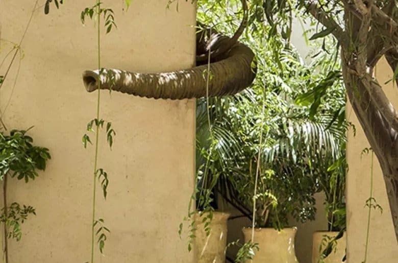 Dreamt up by installation artist Jean-Francois Fourtou, Dar El Sadaka invites guests to travel into the artist’s homage of childhood memories and imagination. His unique animal sculptures of giraffes, snails and orangutans became well known in the 1990s and aim to disconnect the adult eye and see the world through the eyes of a child. After traveling and working around the world Fourtou moved to Dar El Sadaka and transformed the property into his home and creative atelier. The artist places emphasis on the beauty and intricacy of the animals by placing them slightly out of context and playing with the idea of size and proportions. A perfect example of this approach can be seen in the Giant’s House. Located in the gardens, this sculpture plays with scale to evoke childhood sensations, reverting each guest to the size that they were as an infant. The Fallen From The Sky, is also a good example of the artist’s imagination which appears to be an upside down house which has fallen from the sky.