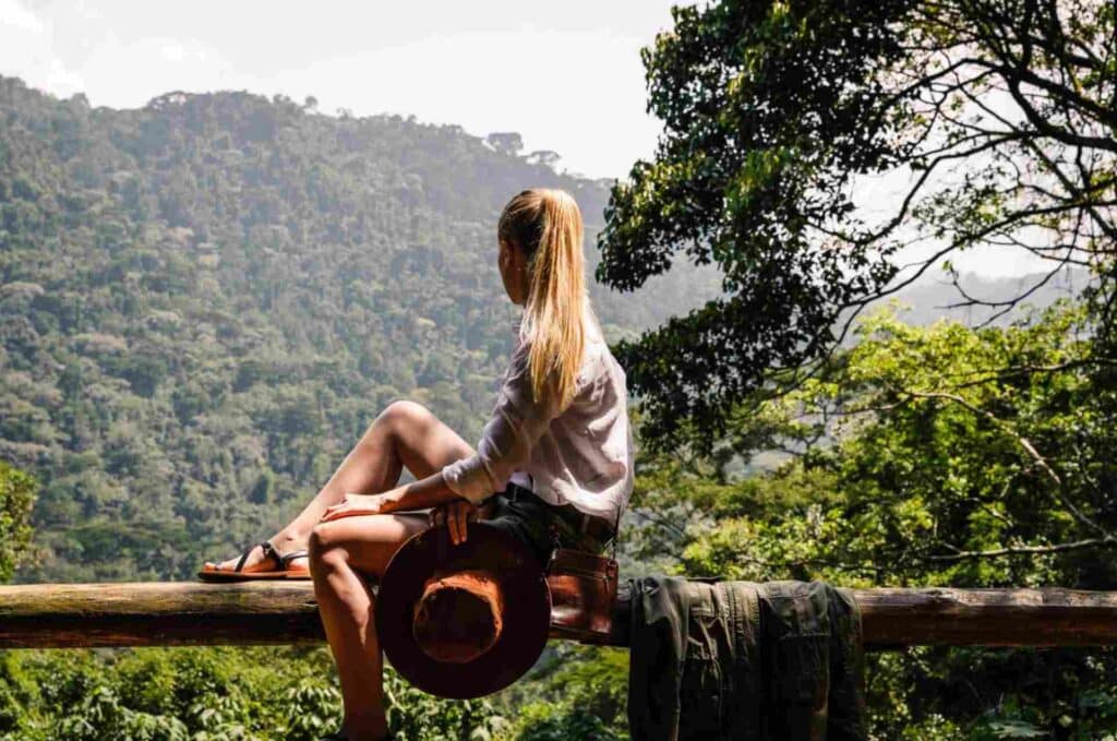 People taking photos in Ugandan rain forest looking in awe. Luxury African safari.