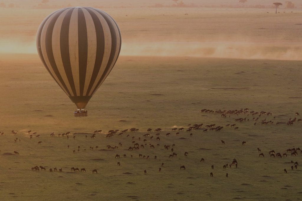 Uganda Great Migration from the view of a hot air balloon. Animals below. Luxury African safari experience.