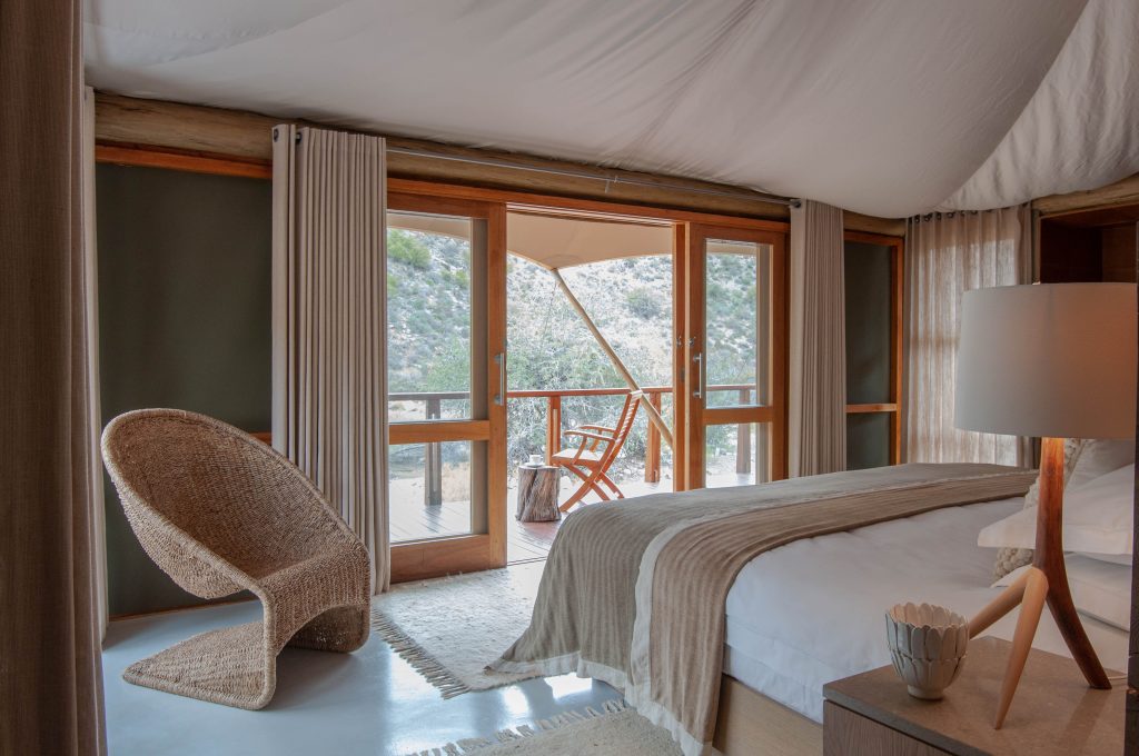 After breakfast you will check out from Grootbos and continue your journey to the Little Karoo, a scenically beautiful drive that will take you approximately 2 hours. Wave goodbye to the whales of Grootbos and get ready for four days of safari experiences. Your driver will transfer you to Sanbona Wildlife Reserve, located on Route 62 – the world’s longest wine route. On arrival at the main gate you will be welcomed by a friendly staff member who will escort you to the welcome lounge. From here you will be collected by your dedicated game driver who will transfer you to your home base for the next three nights, a luxury tented camp. Hidden within the reserve, among striking rock formations, you will find the eco-friendly Dwyka Tented Lodge. Set along the bend of a dry Karoo ravine, the 9 luxury tents reflect the nomadic lifestyle of the Khoisan who roamed the land once before.