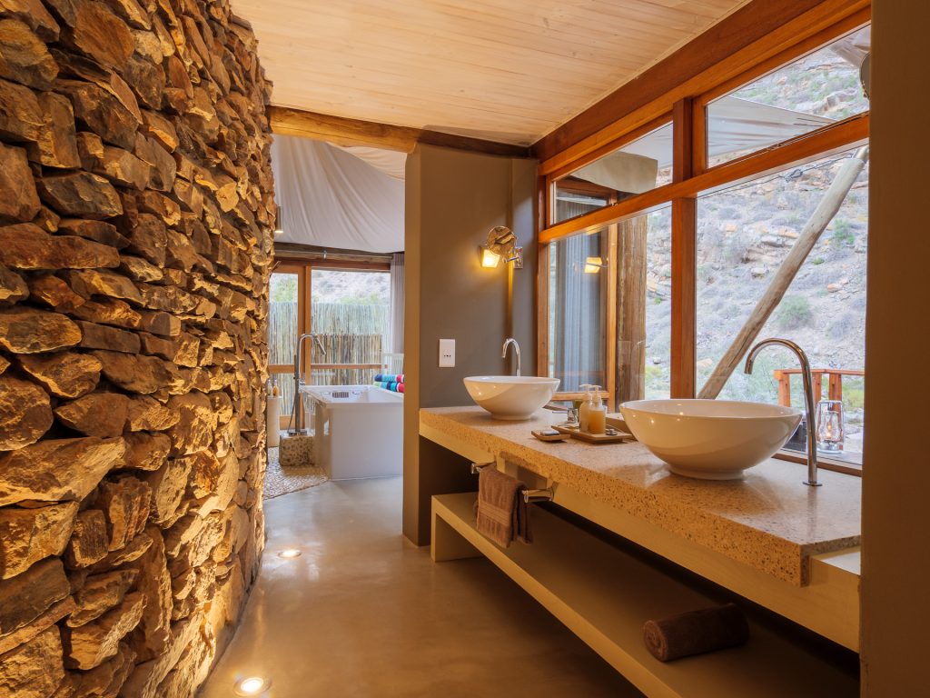 Hidden among striking rock formations, you will find the eco-friendly Dwyka Tented Lodge. Set along the bend of a dry Karoo ravine, the 9 luxury tents reflect the nomadic lifestyle of the Khoisan who roamed the land once before. Each tented suite is fitted with private decks and heated Jacuzzis to enjoy at leisure.