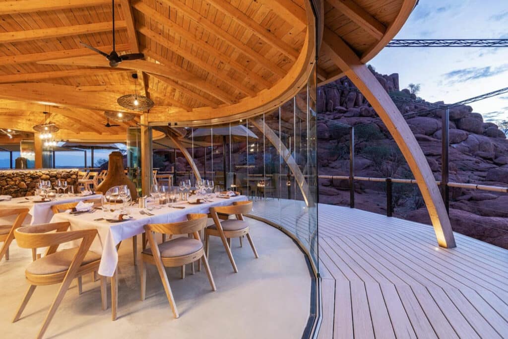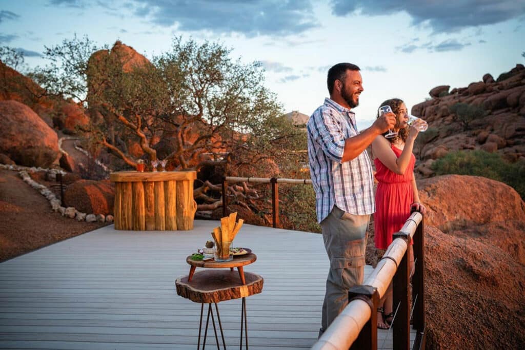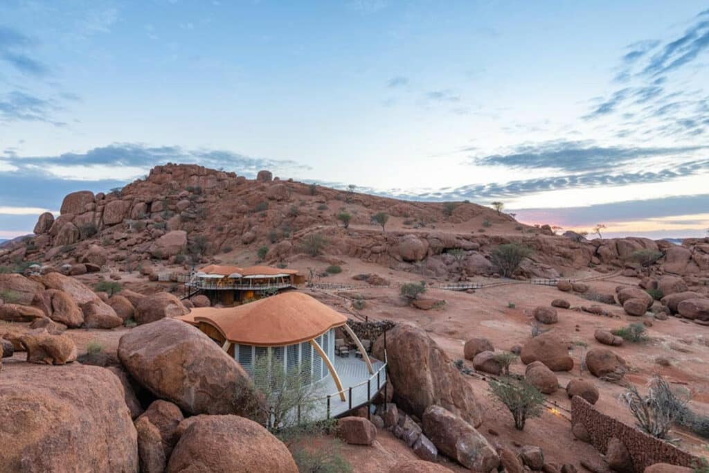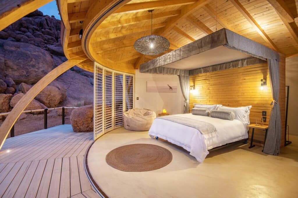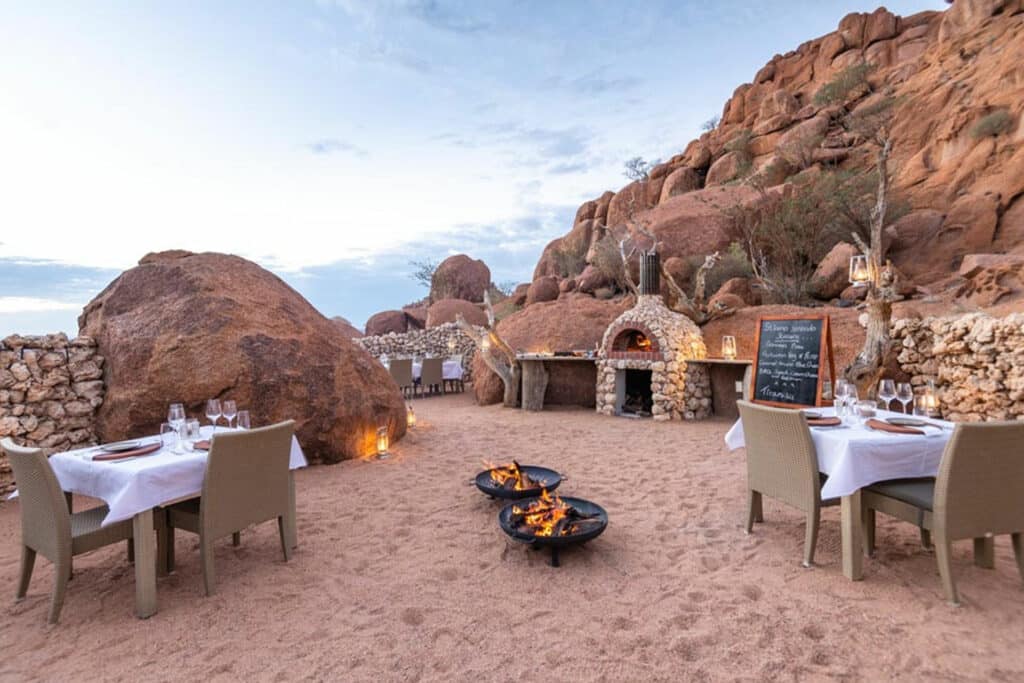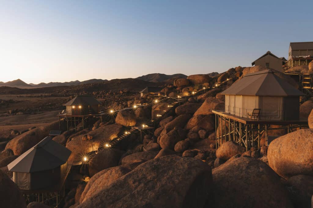 Your journey continues to Damaraland – a region known for its impressive rock formations, ancient river terraces and desert adapted wildlife. Your guide will meet you at Onguma The Fort and transfer you to the local airstrip for your private light aircraft flight to Damaraland. Make sure to take in the sights from above as you fly over Namibia’s breath-taking landscapes. On touch down, a guide will meet you and transfer you to Onduli Ridge. Hidden between granite boulders, this luxury camp offers a remote escape in the heart of Damaraland. Enjoy guided nature drives in search of desert-adapted elephants and rhino or pull on your walking shoes for a guided bush walk. A highlight of your time here will be a private 4×4 excursion to the UNESCO World Heritage Site of Twyfelfontein where you can witness ancient rock engravings. In the evening, be sure to roll your starbed out onto your private deck and drift off under a blanket of stars.