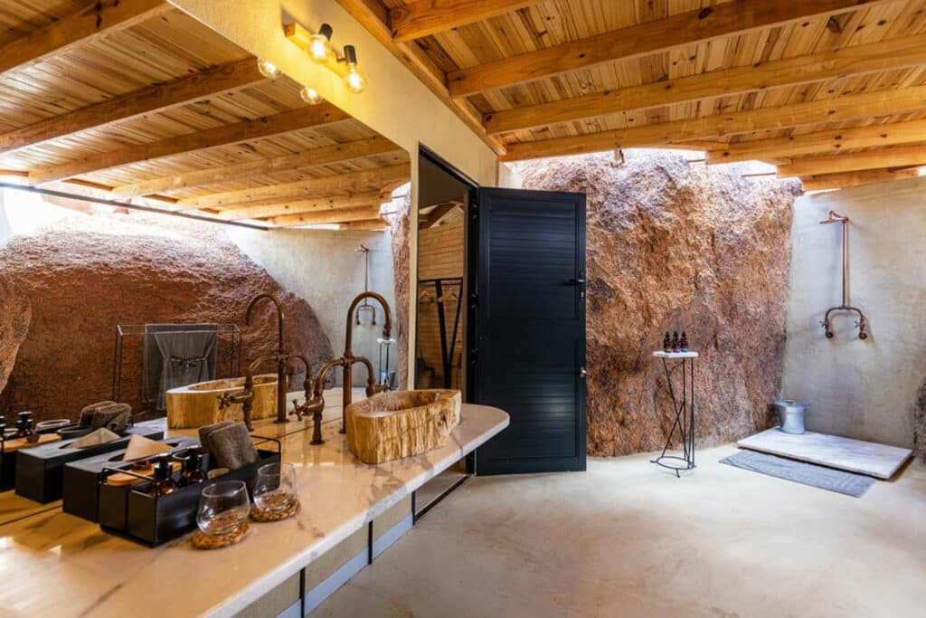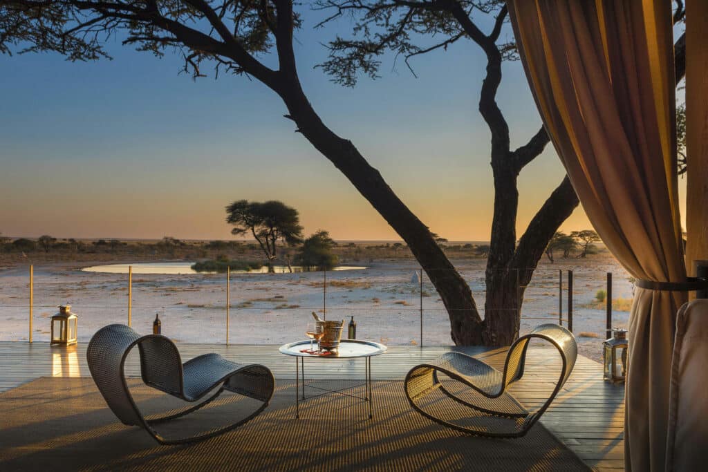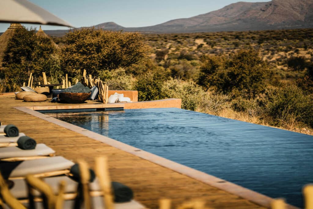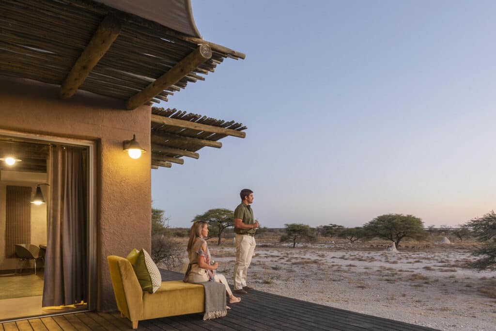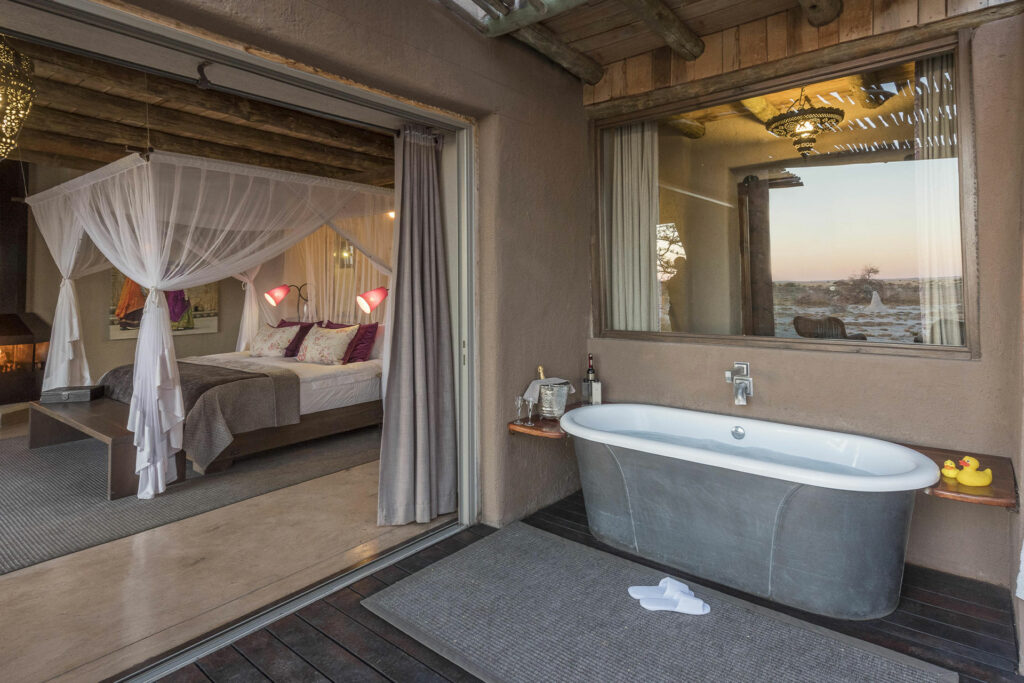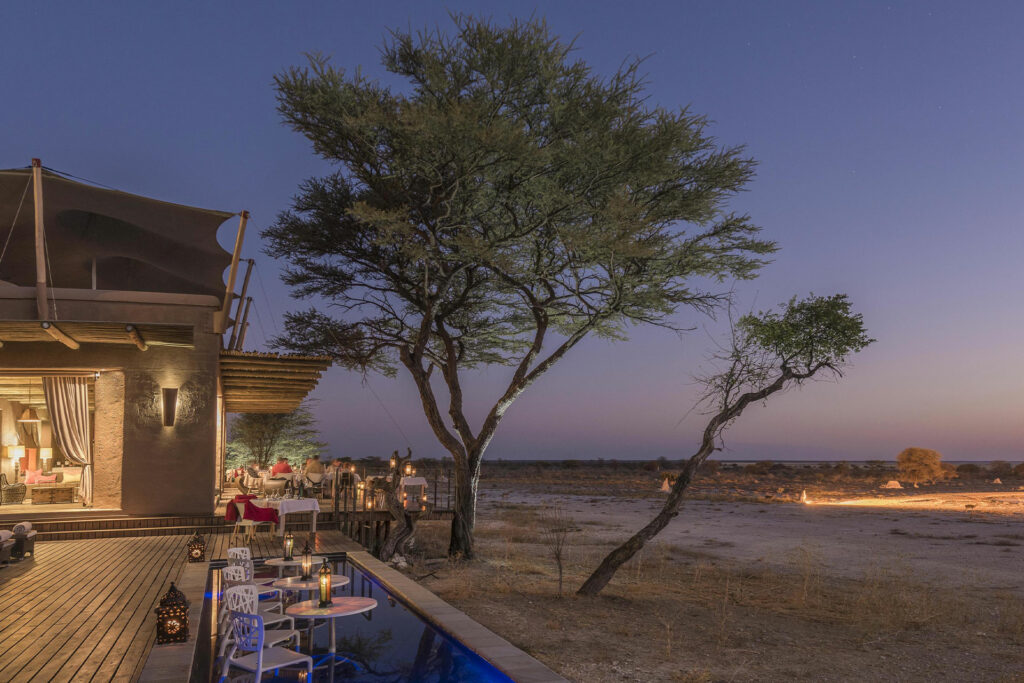 This unique Moroccan-inspired lodge is located on the border of Etosha National Park in Onguma Game Reserve. The lodge consists of 11 luxurious suites that overlook an active waterhole and the breathtaking Etosha pans. Each suite is fitted with a fireplace, outdoor shower and private deck.