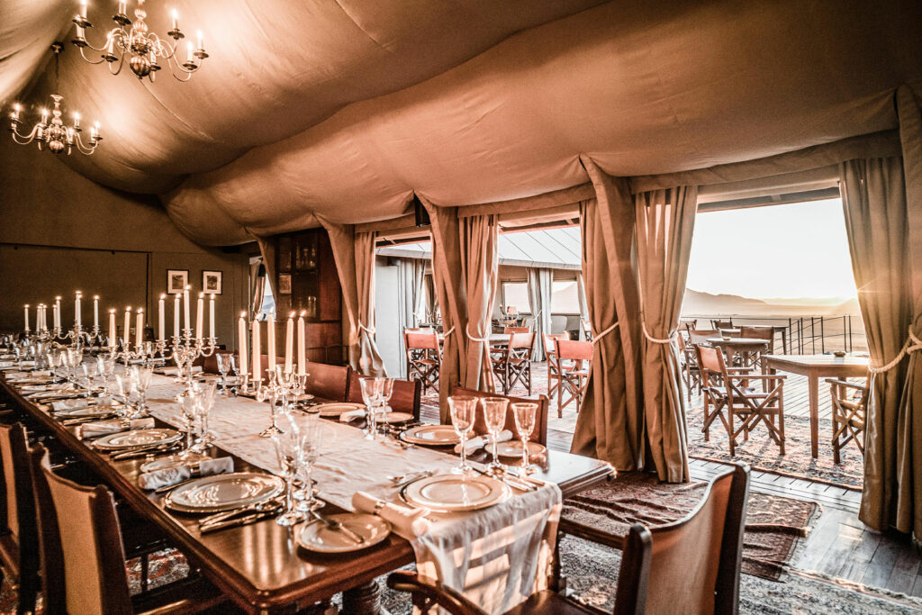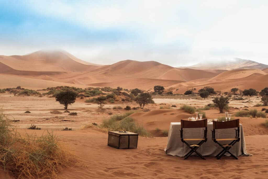 The final stop on your Stargazing Desert Safari in Namibia takes you to the southernmost part of the ancient Namib Desert. On touch down, a camp representative will meet you and transfer you to Zannier Sonop. Located in a private reserve, this opulent tented camp is set on top of granite boulders and overlooks 13,800 acres of untouched wilderness. Discover this region on morning and sunset nature drives, unique horse riding excursions in the desert and expertly guided desert walks. When the night sky is at its most dazzling, you can make your way to the observation deck for a stargazing experience par excellence or snuggle up on a lounge chair at the camp’s open-air cinema. Your time here includes an incredible 4 course outdoor dining experience on top of one of nearby dunes.