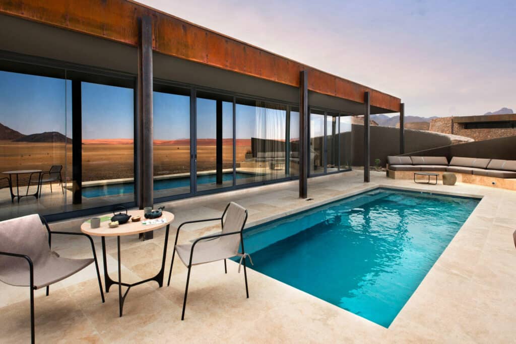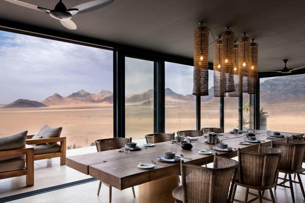 Located in the Sossusvlei Private Desert Reserve, on the border of an International Dark Sky Reserve, Sossusvlei Desert Lodge features 10 luxurious stone and glass suites fitted with a living room, large retractable skylight, shaded veranda and a private plunge pool that overlooks the desert vista. The main guest area includes a bar, sitting room, walk-in cellar and interactive kitchen, as well as a sunrise fitness centre and spa.