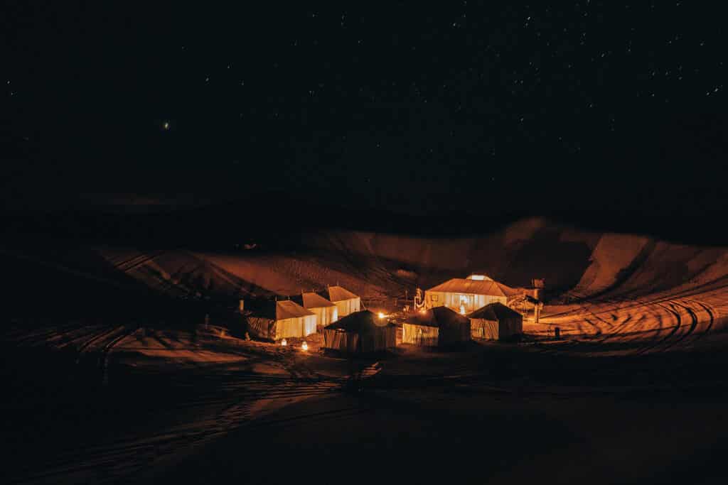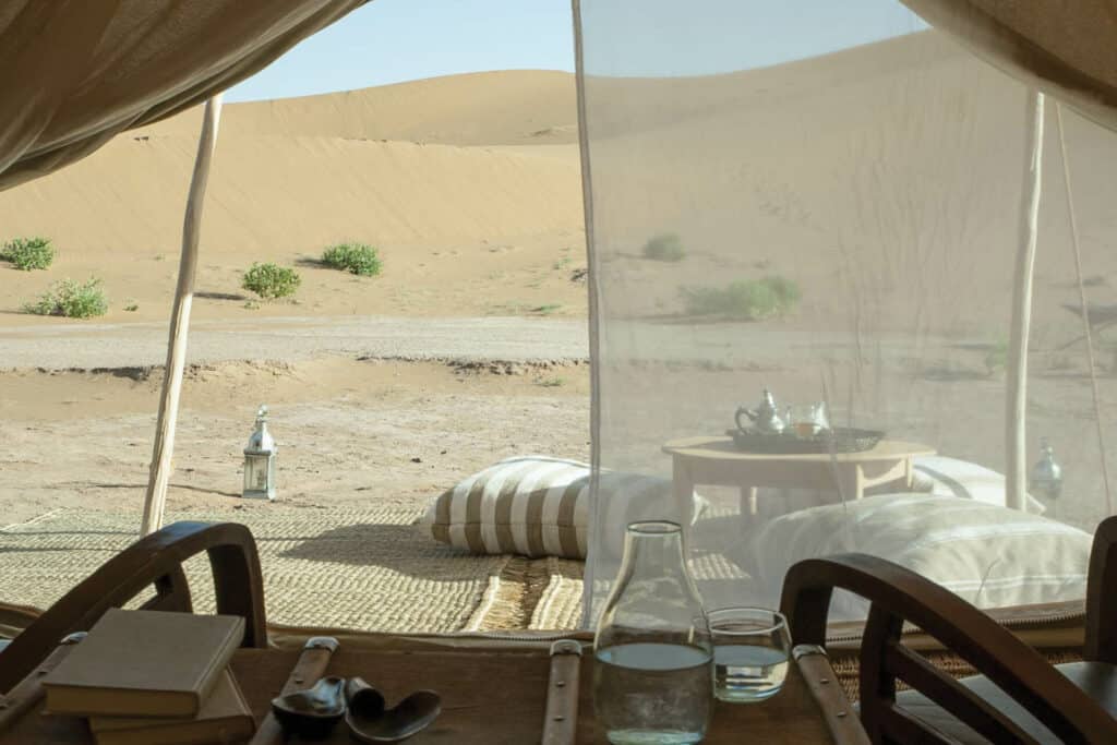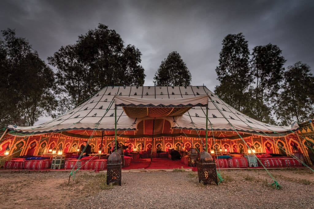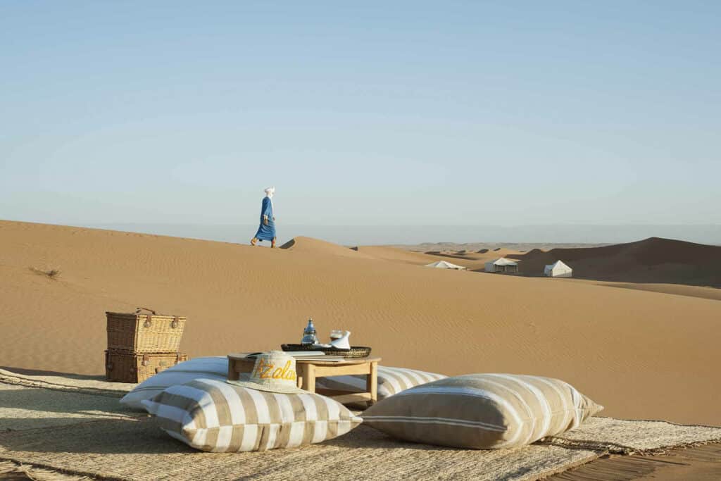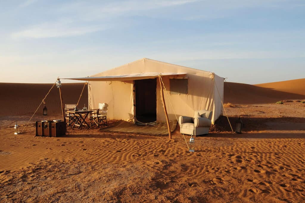 Day 6 marks the start of your nomadic Luxury Morocco Adventure into the desert. After breakfast, your driver will meet you and transfer you by 4×4 towards the Southern Sahara Desert. Admire the changing landscapes as you make your way through arid mountainous landscapes to palm plantations and cultivated fields. Enroute stop at Azalai Lodge, hidden in the palm grove of Zagora for a summer lunch by the swimming pool before heading to the desert. Isolated between dunes, you will stay in a luxury marquee tent in the heart of the desert. Your desert adventure starts with a sunset camel ride followed by a candlelit dinner under the stars.