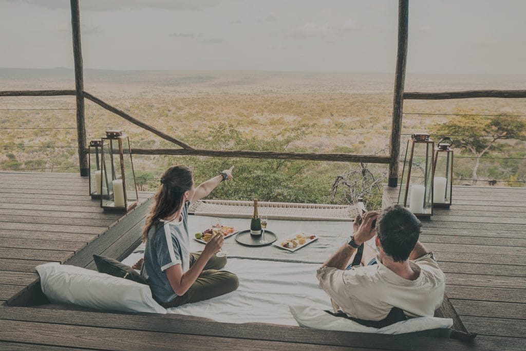 Couple enjoying a romantic meal and panoramic views from a cozy terrace setup during their honeymoon in Tanzania.